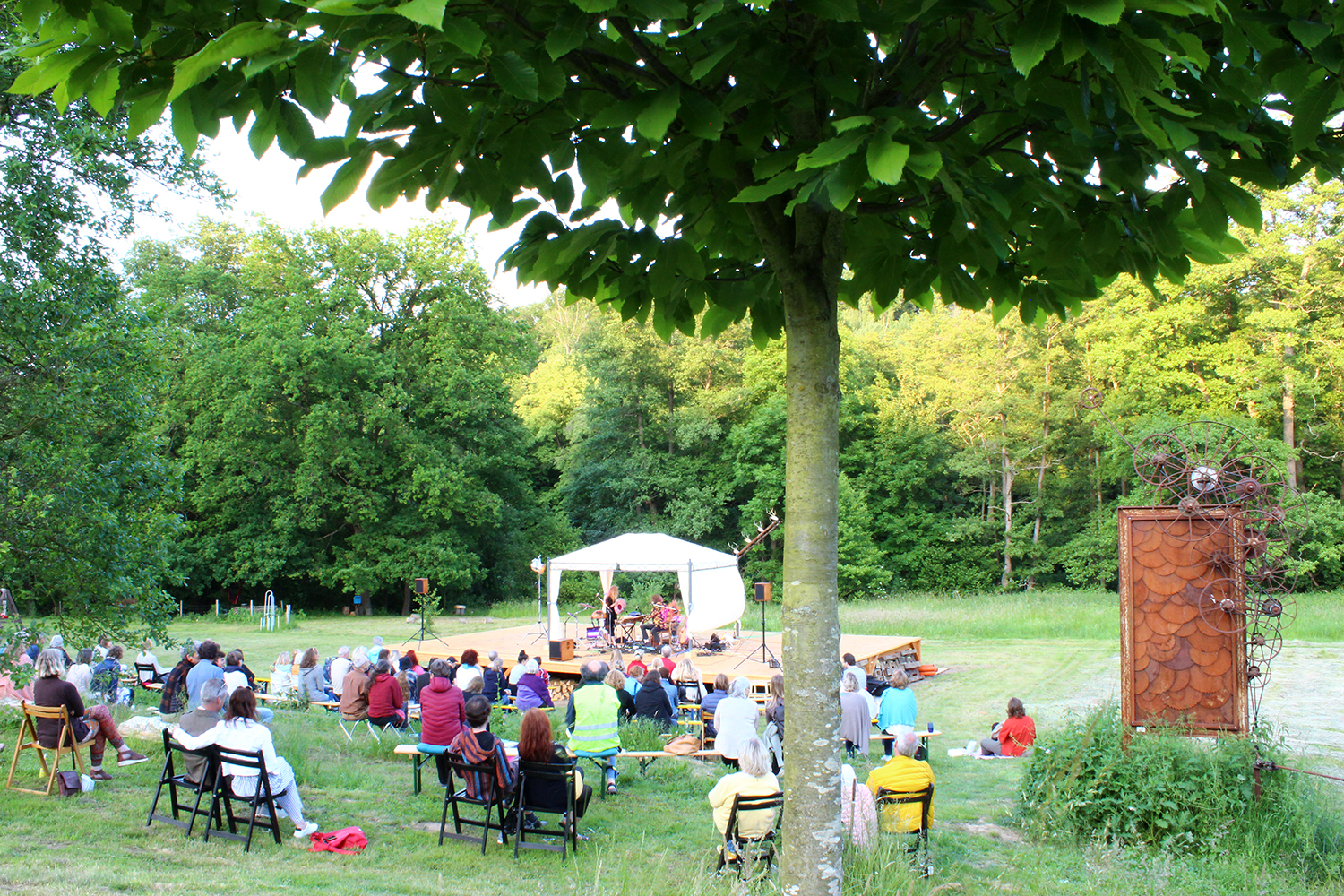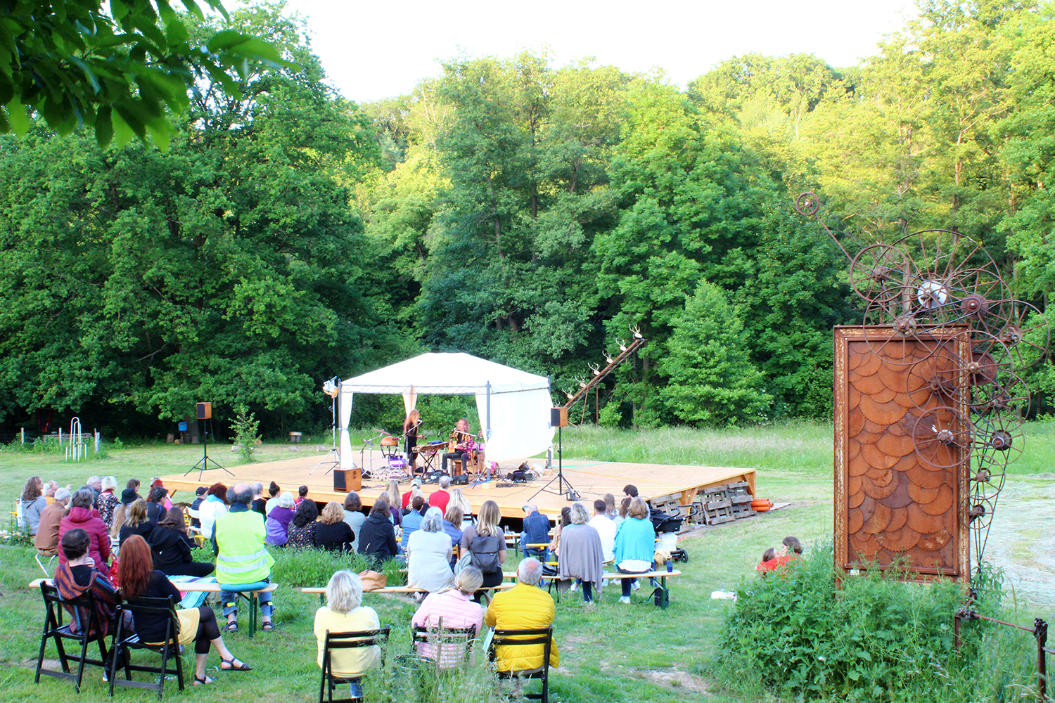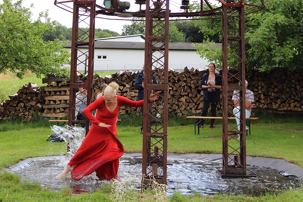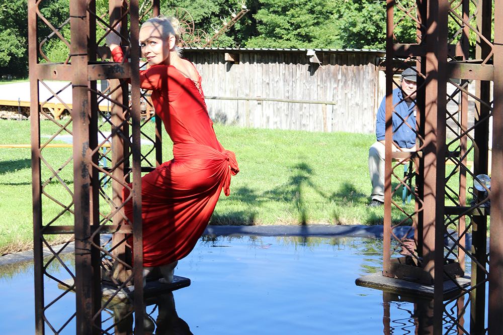 Doch damit nicht genug: Das Tänzerduo Lotta Svalberg und Pascal Sani hat das weitläufige Gartengelände mit einer knapp 100 m² großen Freilichtbühne in einen Ort der Begegnung verwandelt – mit kulturellen Veranstaltungen und Kunstmaschinen des Kinetik-Künstlers Willi Reiche.